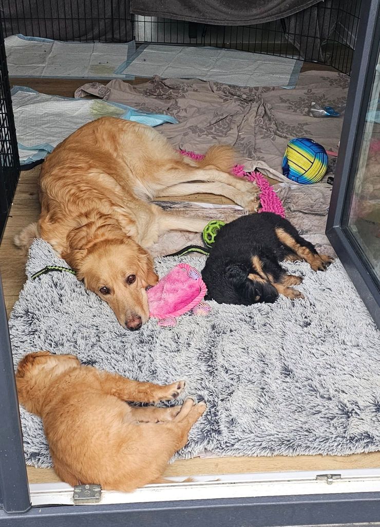 Dakule štěńátka už odstavila, ale stále si za nimi chodí hrát, okusovat a odpočívat. Je to opravdu skvělá máma.